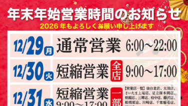 お知らせ 年末年始営業時間のお知らせ 2025年12月15日 年末年始営業時間についてご案内申し上げます 日頃よりプロストックをご利用いただき、誠にありがとうございます。年末年始営業時間についてご案内申し上げます 一部店舗が9時~17時の短縮営業をいたします。1月1日から3日は... お知らせ